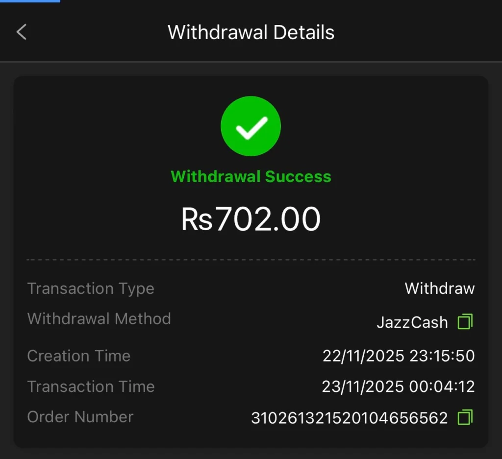- Withdrawal: 702 PKR via Jazzcash → Arrived in under 3 minutes